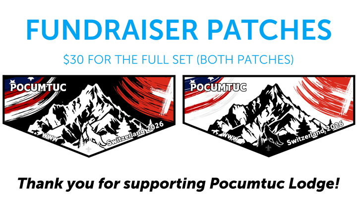 Pocumtuc Lodge is taking 30 Arrowmen to the Kandersteg International Scout Centre in 2026, and the trip wouldn't be complete without some swag! Help support the contingent by purchasing patches specifically designed for this trip. All profits will directly support Arrowmen attending this trip.